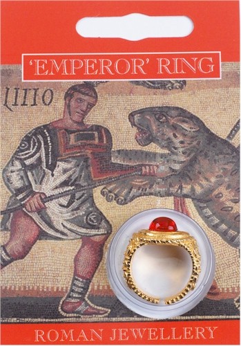 Gold Plated pewter Emperor’s gem ring supplied in a clear blister on an information card which explains about Roman jewellery and also about the games at the amphitheatre.