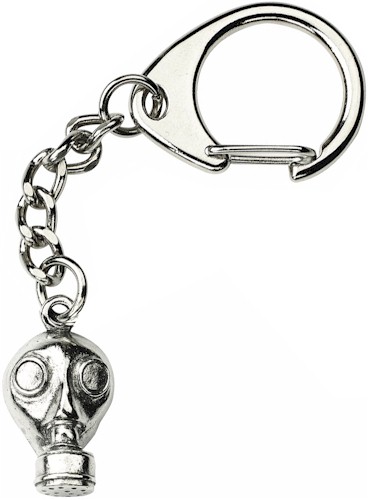 A pewter World War I Gas Mask mounted on a quality key chain. The key-ring is supplied with a header card.