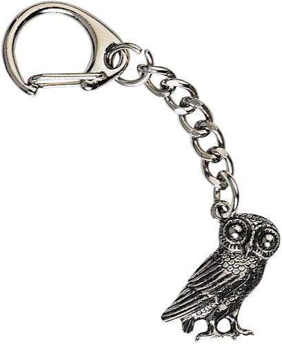A pewter Greek owl of Athena supplied on a quality key chain. The key-ring is supplied with a header card.