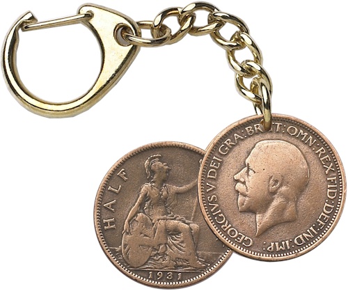 An original George V Half Penny coin supplied on a quality key chain. The key-ring is supplied with an Original Coin header card.