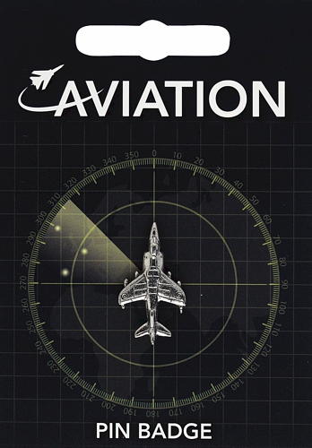 A Harrier jump jet in pewter supplied on a pin with clasp. The information card gives a brief history about the developments in aviation.