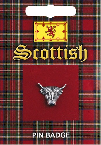 A Highland Cow Head made in pewter supplied on a pin with clasp. The information card provides brief information about Scotland’s history and cultural heritage.