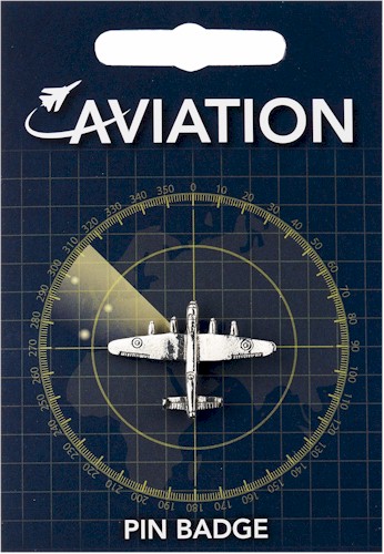A Avro Lancaster in pewter supplied on a pin with clasp. The information card gives a brief history about the developments in aviation.