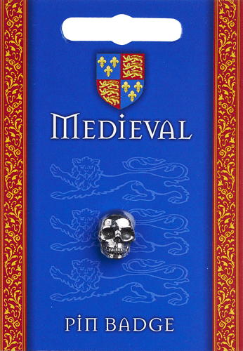 Pewter medieval skull supplied on a pin with clasp. The information on the reverse of the card explains about heraldry and heraldic designs.