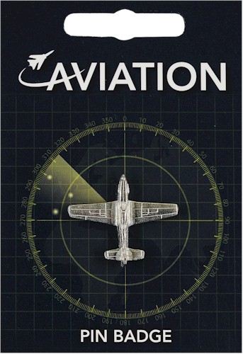A Mustang P-51 in pewter supplied on a pin with clasp. The information card gives a brief history about the developments in aviation.
