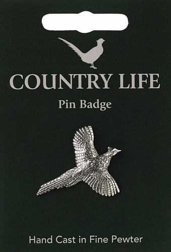 A pheasant in pewter supplied on a pin with clasp. The information card gives details about the countryside.