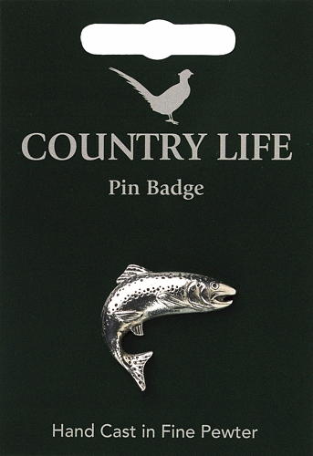 A salmon in pewter supplied on a pin with clasp. The information card gives details about the countryside.