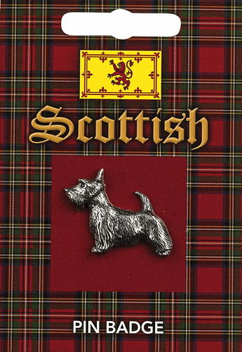 A Scottish Scottie dog made in pewter supplied on a pin with clasp. The information card provides brief information about Scotland’s history and cultural heritage.