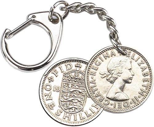 An original Elizabeth II Shilling coin supplied on a quality key chain. The key-ring is supplied with a header card.