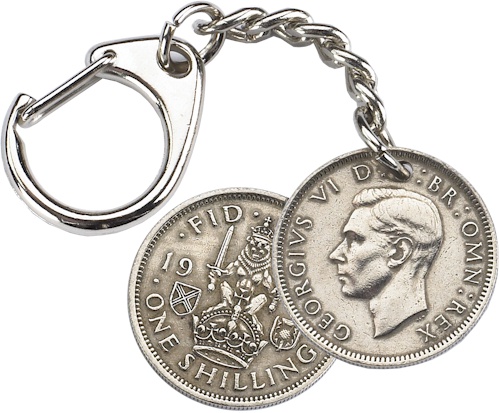 An original George VI Shilling coin supplied on a quality key chain. The key-ring is supplied with an Original Coin header card.