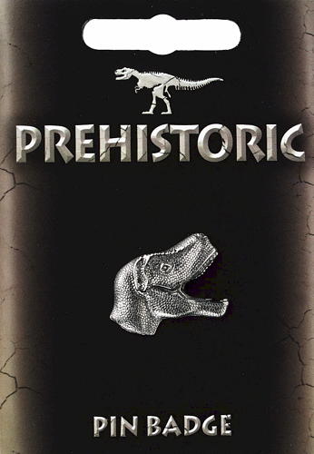T-Rex head in pewter supplied on a pin with clasp. The information card gives details about dinosaurs.