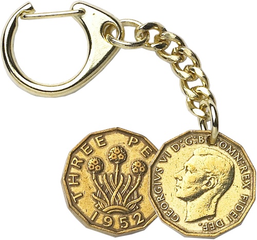 An original George VI Threepence coin supplied on a quality key chain. The key-ring is supplied with an Original Coin header card.