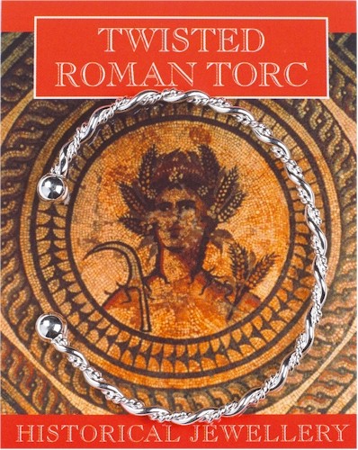 Silver plated twisted torc supplied with an information card that describes how torcs were worn during Roman times and also about the mosaic on the front of the card.