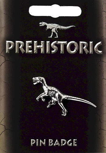 A Velociraptor in pewter supplied on a pin with clasp. The information card gives details about dinosaurs.