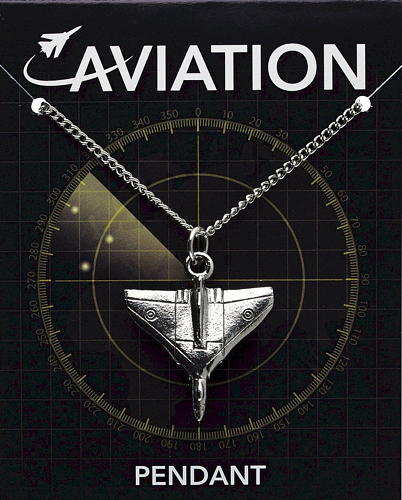 A Vulcan bomber in pewter supplied on a silver chain. The information on the reverse of the fold-over card gives a brief history about the developments in aviation.