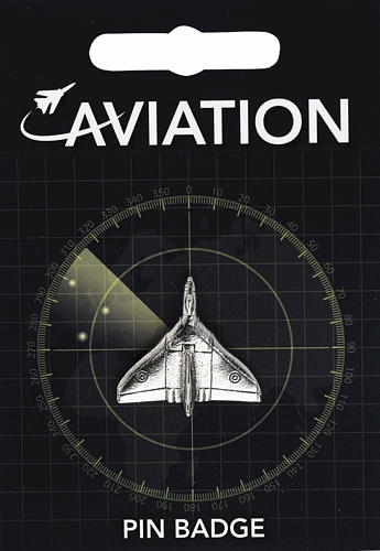A Vulcan bomber in pewter supplied on a pin with clasp. The information card gives a brief history about the developments in aviation.
