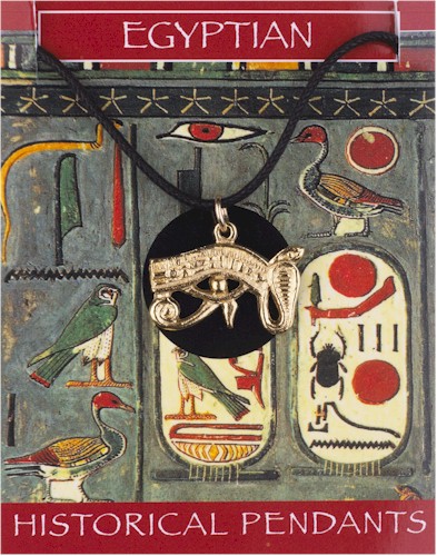 Gold plated pewter wadjet eye supplied on a waxed cord. The information on the reverse of the card describes how animals were an important part of Egyptian life and many were seen as gods.