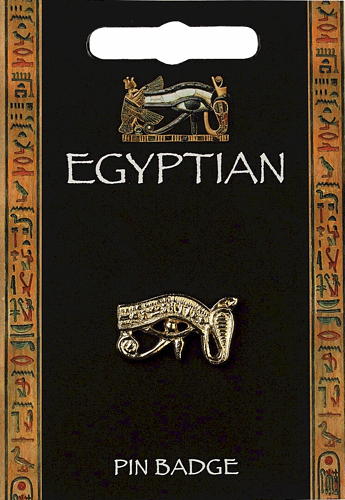 Gold plated pewter Wadjet Eye supplied on a pin with clasp. The information on the reverse of the card describes how Pharoahs and wealthy Egyptians were buried.